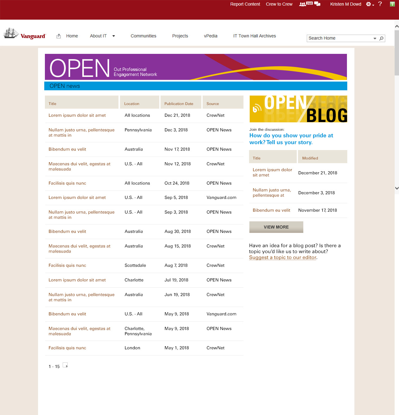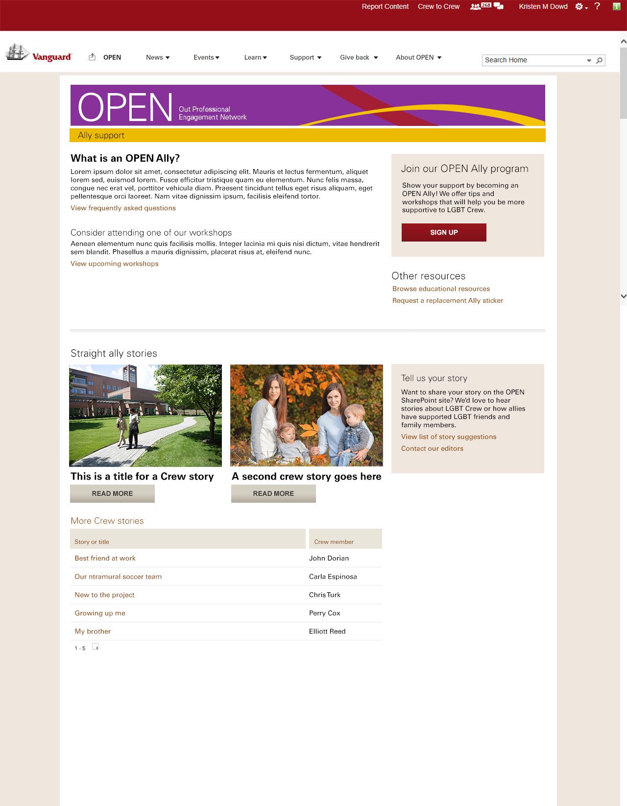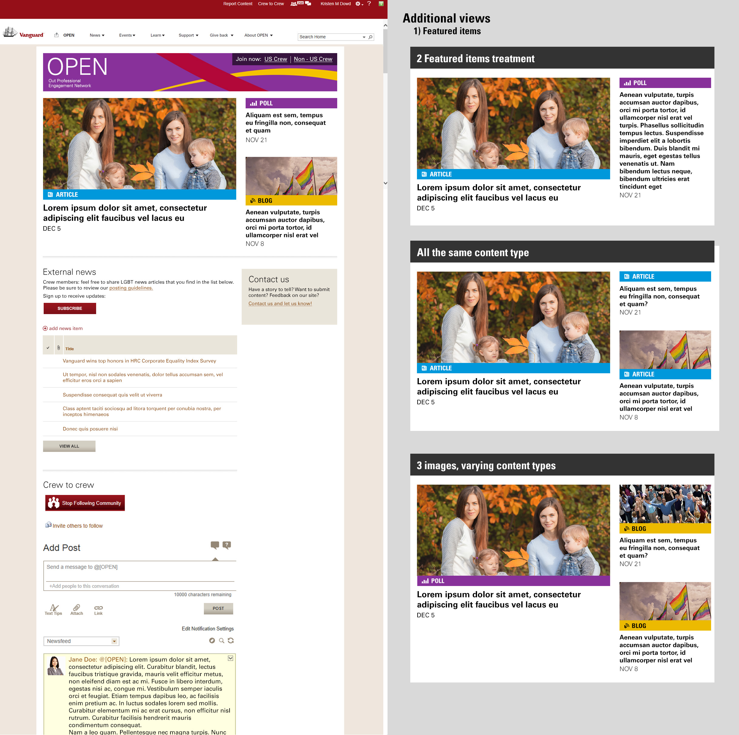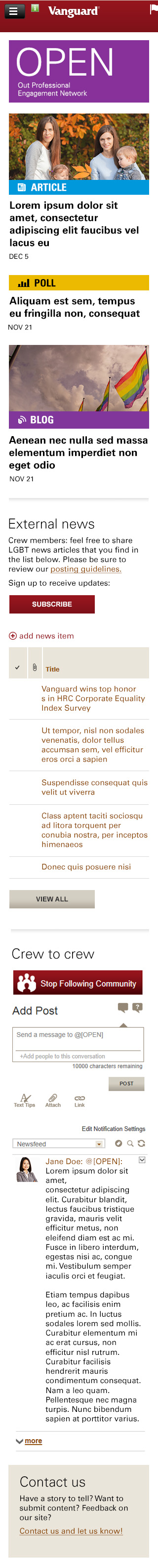 The Vanguard group offers resource groups to their employees, including the “Out Professional Engagement Network” (or “OPEN”), which connects LGBTQIA+ and ally employees with business and educational opportunities, news, volunteering opportunities, and more. The clients expressed a desire to update the look and feel, but also remarked that many of the members had expressed a desire to be connected to local events, support groups, internal and external news, and share or read about one another’s experiences-none of which, the site facilitated at that point in time. We are a global company, so the site leads expressed a need to distinguish the location to which each piece of information pertained.