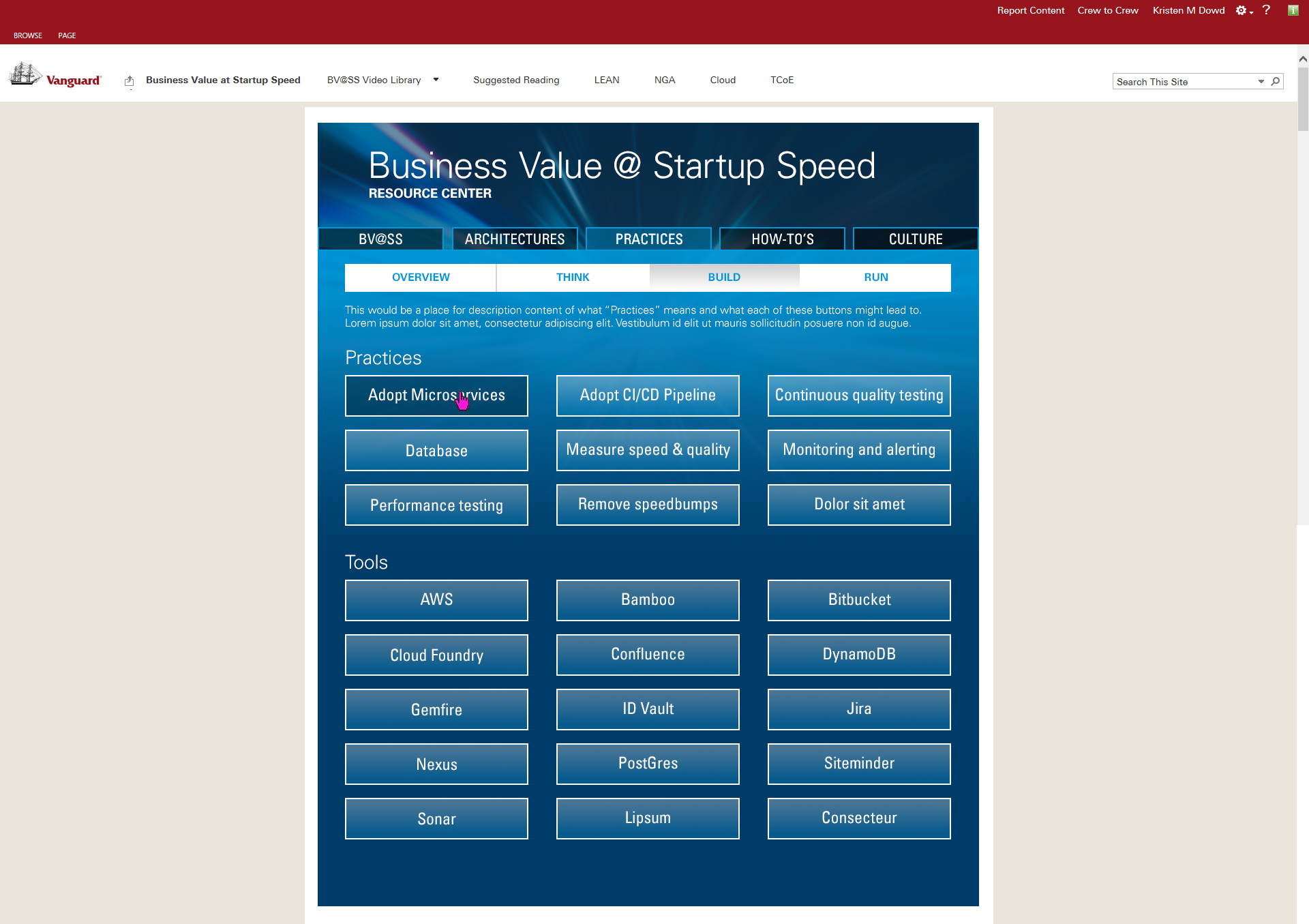 I delivered an internal team site with a storefront triage, featuring varying levels of information complexity depending on the user's request. For example, the user could come to our site wondering something a simple as “What does BV@SS stand for?” or as complex as “How do I implement a CI/CD pipeline?” The interviews conducted with our highly-technical, BV@SS-migrated emplloyees helped to determine the Information Architecture and language of the tab seets. Said tab content and buttons are populated dynamically by leveraging jQuery code that reads from a SharePoint list in order to fulfil the business goal of creating a custom-branded and low-maintenance solution.