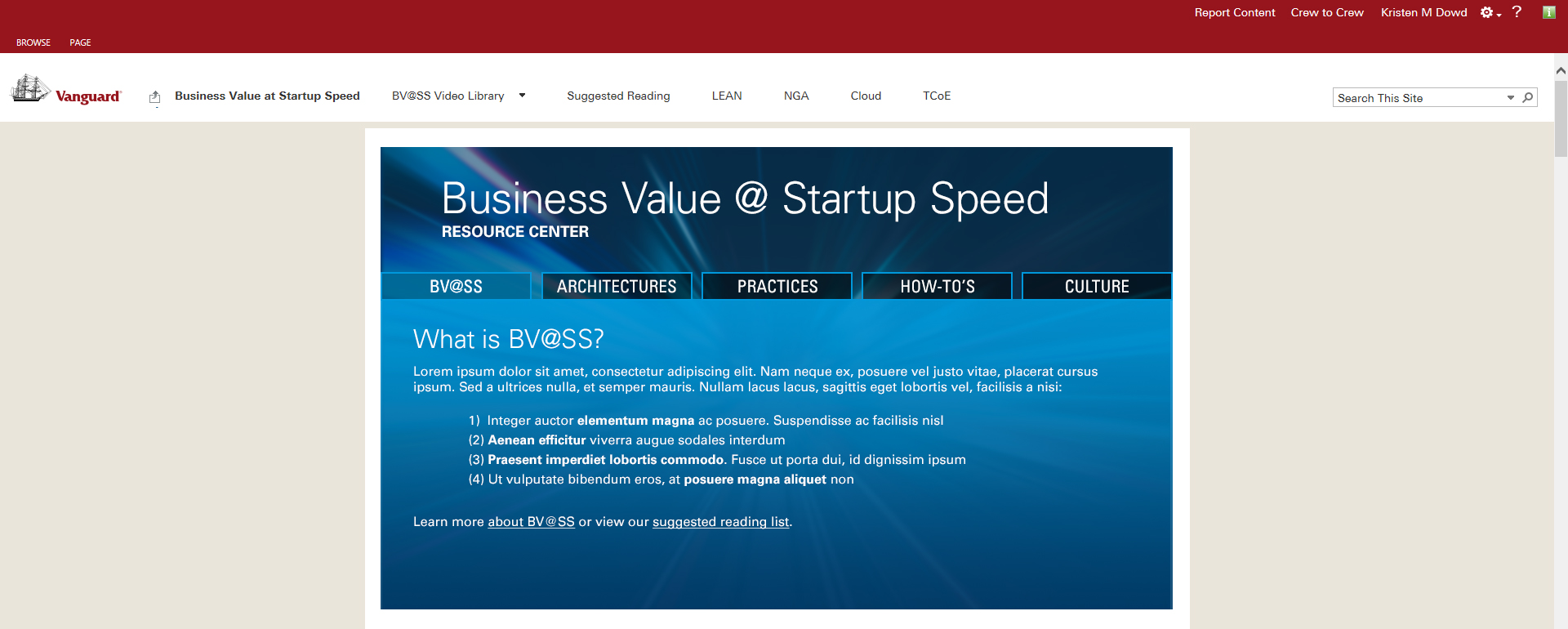 As a large, established company, one of the challenges our Information Technology (IT) division faces is the desire to achieve strong business results with the same fast pace as a smaller, start-up company. Our Chief Technology Office lead the charge to develop a methodology and supporting tools for achieving this goal. While the BV@SS buzz word had been gaining traction, and the principles had buy-in from all of the IT subdivisions, the challenge was determining how best to communicate what changes were occurring, and maintaining a consistent location to store information about said changes.