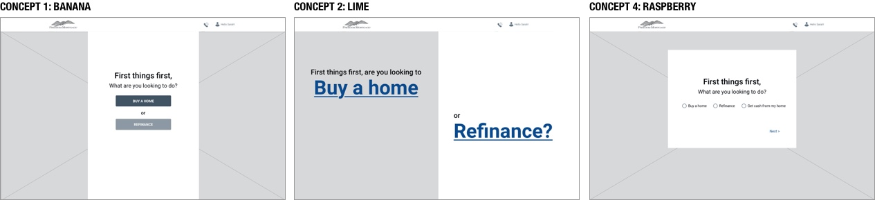 While concept 2 "Bard" and Concept 3 "Druid" look visually similar, Concept 3, "Druid" asks additional questions about budget, credit score, refinancing goals, and timeline. We included this concept because the business had a desire to capture more data. We found that asking more specific questions made users feel more confident that the end result would be a more accurate rate and greater overall trust in the legitimacy of the company.