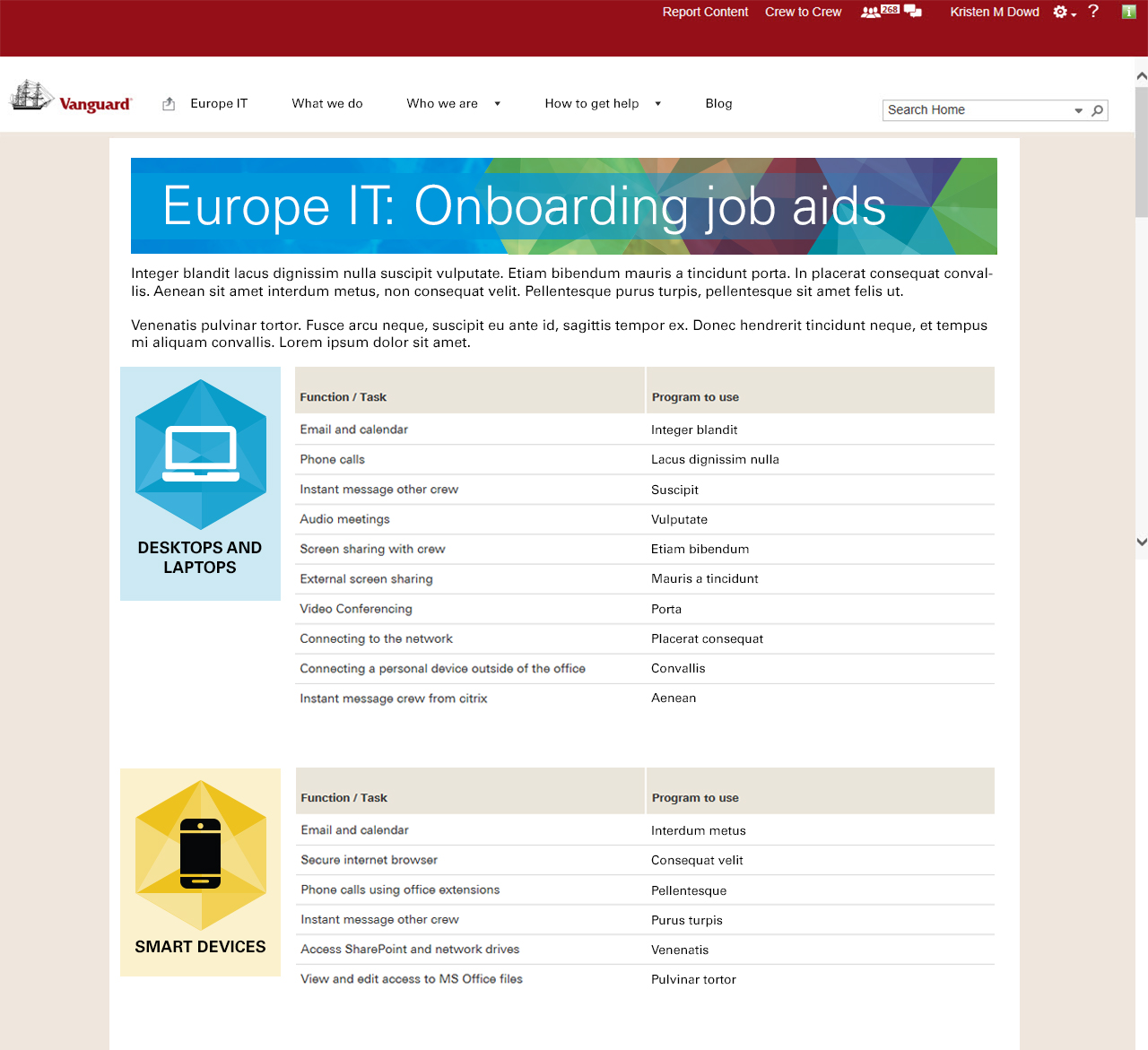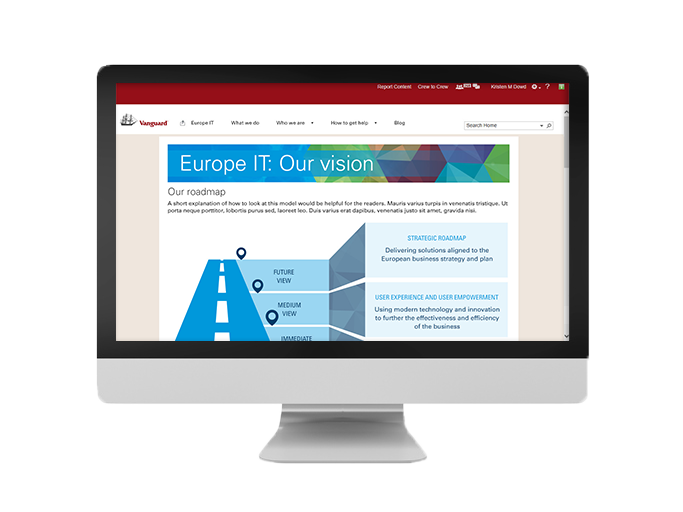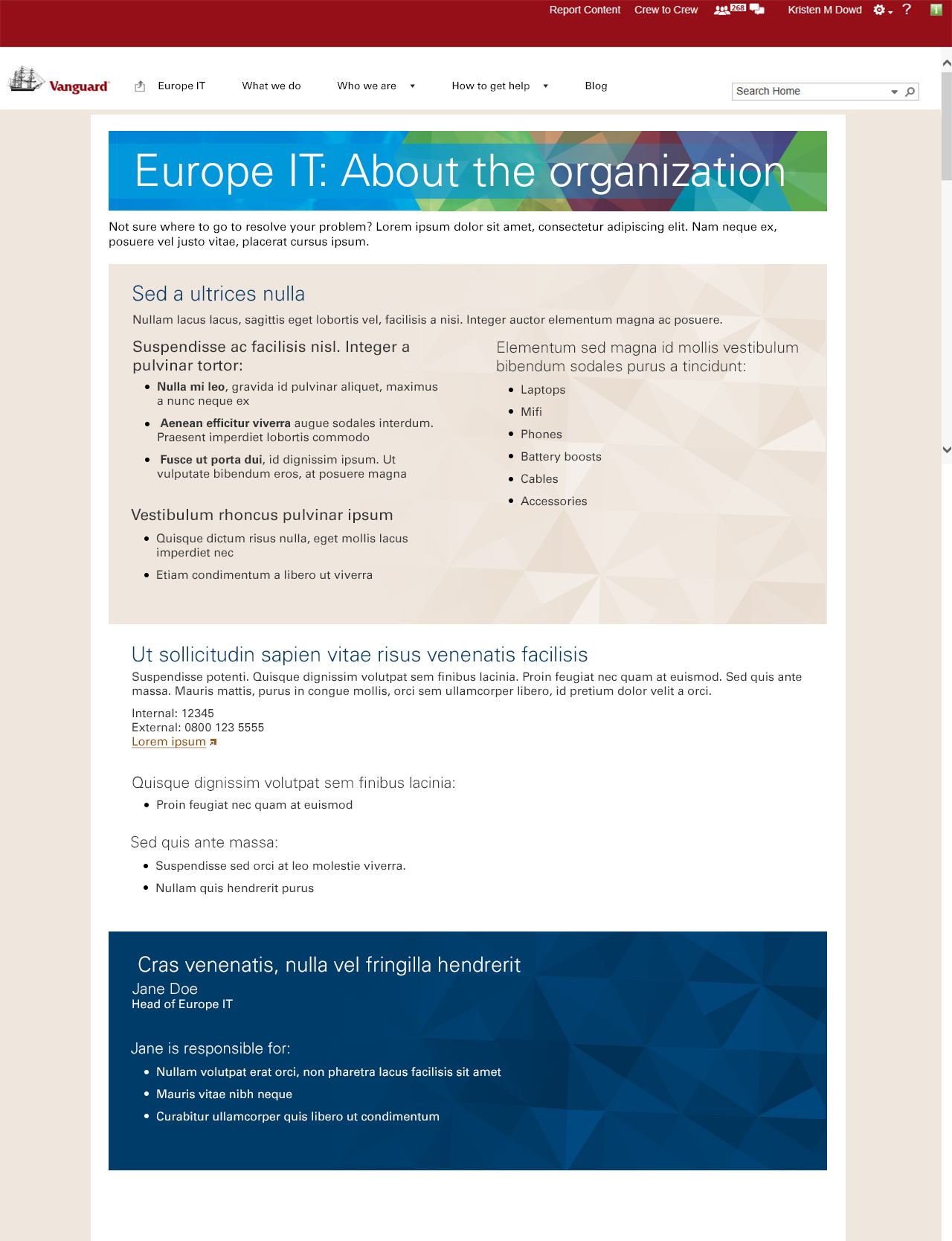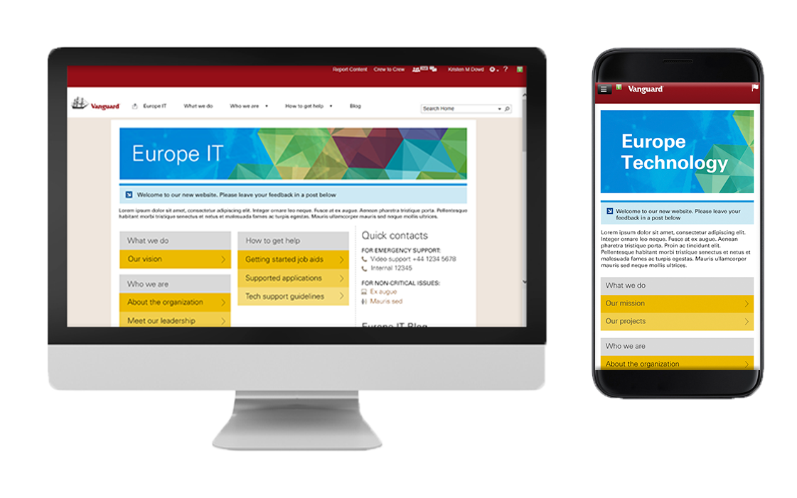 First, I created custom compositions for the design of the site and worked closely with the Europe IT head to develop branding that felt both unique to their office, but compliant with company brand standards. He liked the idea of using sort of a quilt of colorful shapes as a reusable pattern, but also toning it down with the hues of blue that the enterprise had come to associate with IT. I made sure to balance the desire for custom branding with scalability by isolating custom solutions to features that were not likely to change over time and using more out-of-the-box SharePoint components for sections that were likely to change.