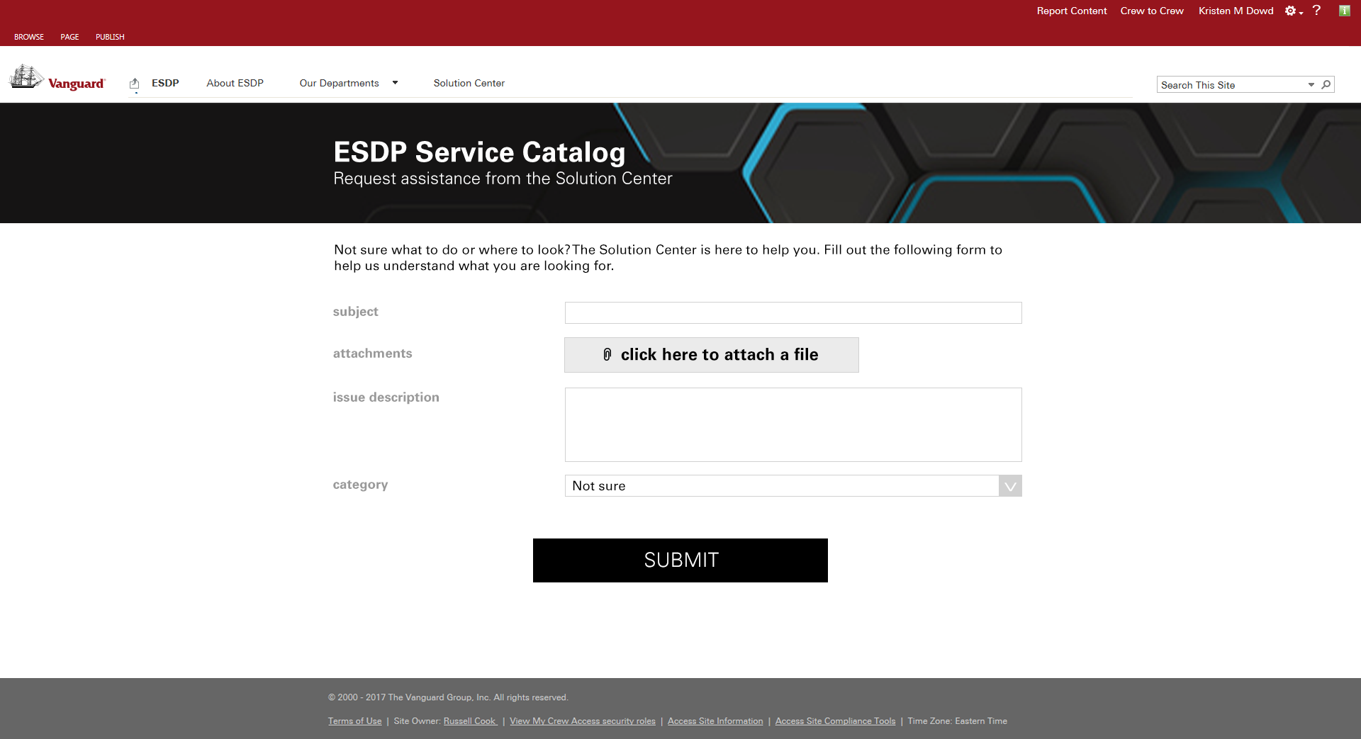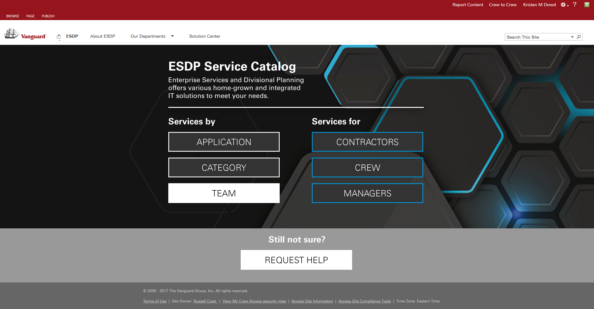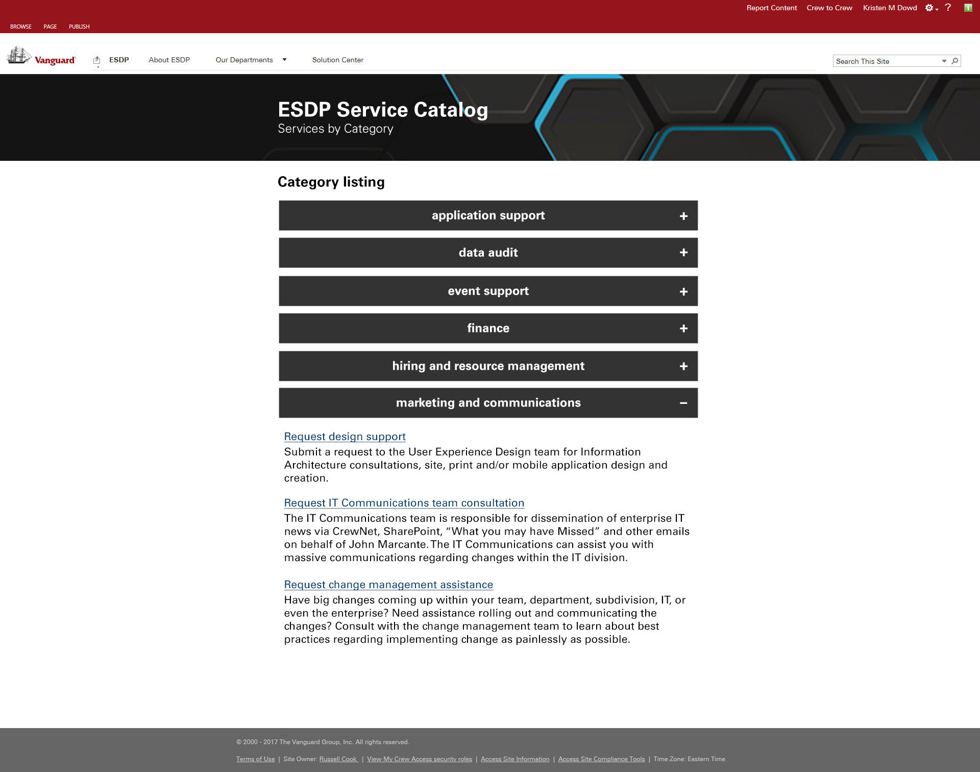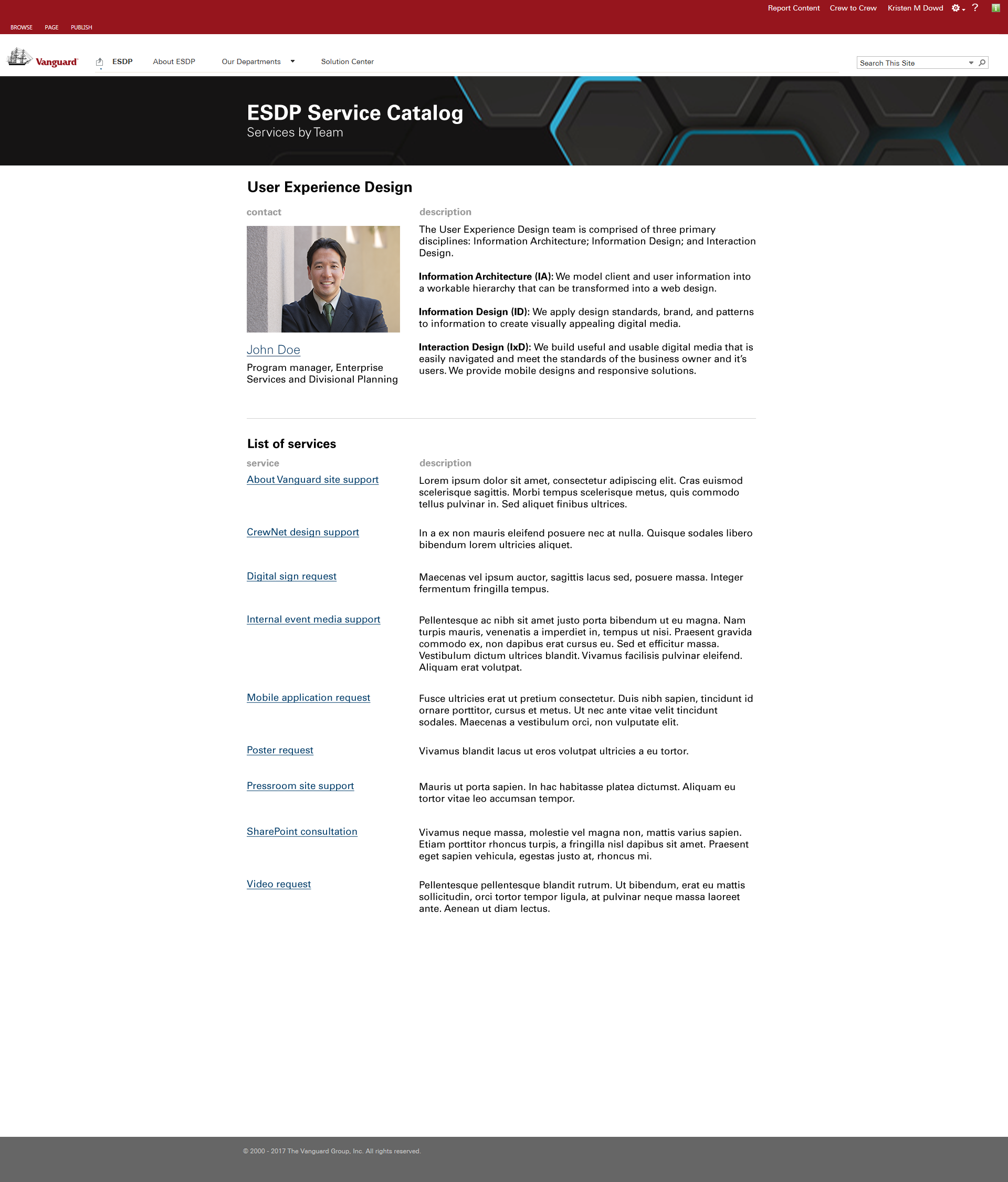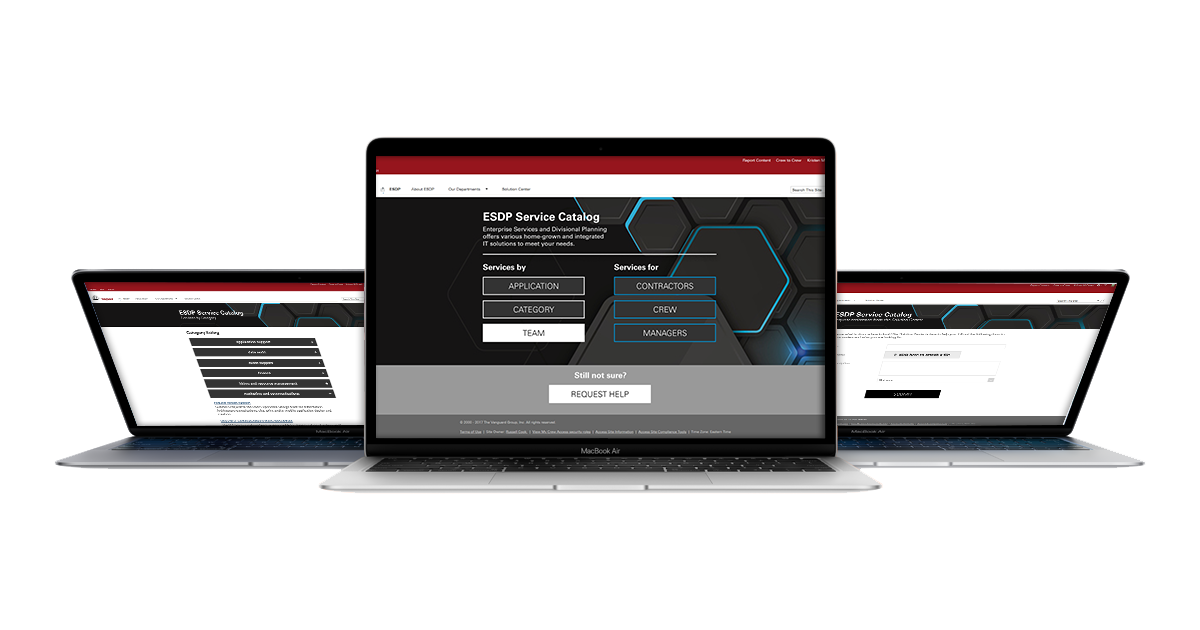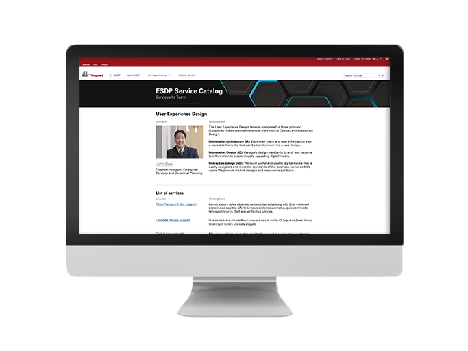 The solution was a custom SharePoint site where the home page functioned as a triage to start users on their path to find the service they were looking for by starting with high-level categories to which our users reported resonation. These categories pointed to media queries that would return the correct team, service or product and the process by which a user would go about requesting said service or product.